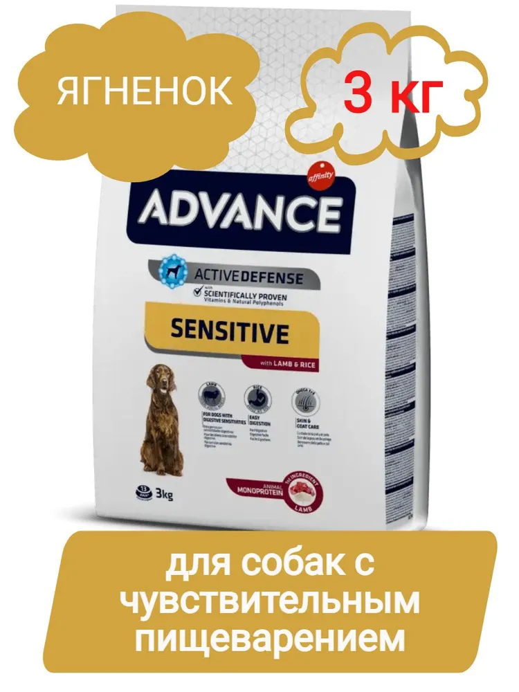 Advance Dog Sensitive Lamb & Rice — это полноценный сухой корм для взрослых собак всех пород с чувствительным пищеварением. Он помогает поддерживать здоровье кишечника, укрепляет иммунитет, а также заботится о коже и шерсти питомца.
