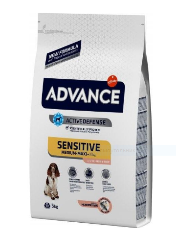 Advance Dog Sensitive Salmon&Rice - это корм премиум-класса, рекомендованный для взрослых собак средних и крупных пород с непереносимостью мясного белка и других ингредиентов, часто ассоциируемых с чувствительной системой пищеварения.