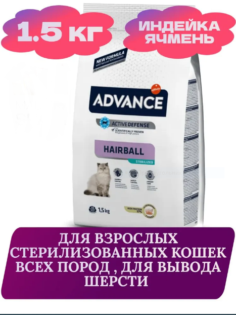 Advance Cat Sterilized Hairball (Индейка и ячмень) — это корм премиум-класса для стерилизованных кошек и кастрированных котов с проблемами образования комков шерсти.