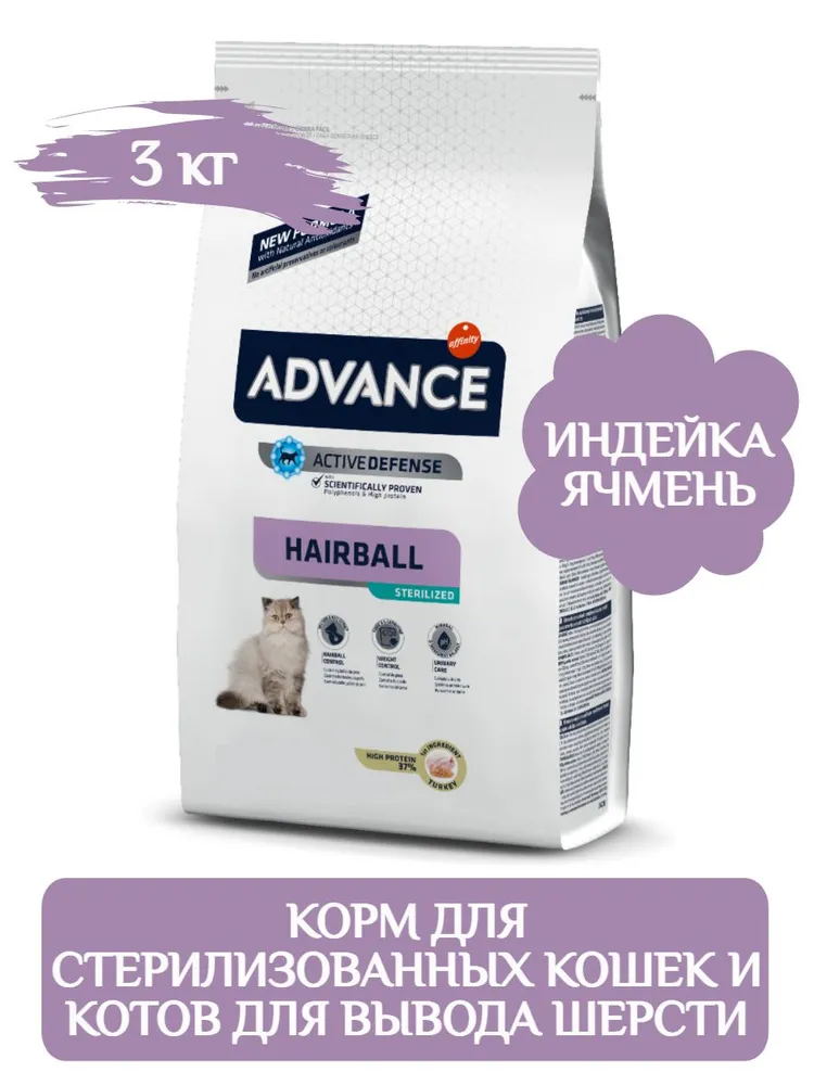 Advance Cat Sterilized Hairball (Индейка и ячмень) - это корм премиум-класса для стерилизованных кошек и кастрированных котов с проблемами образования комков шерсти.