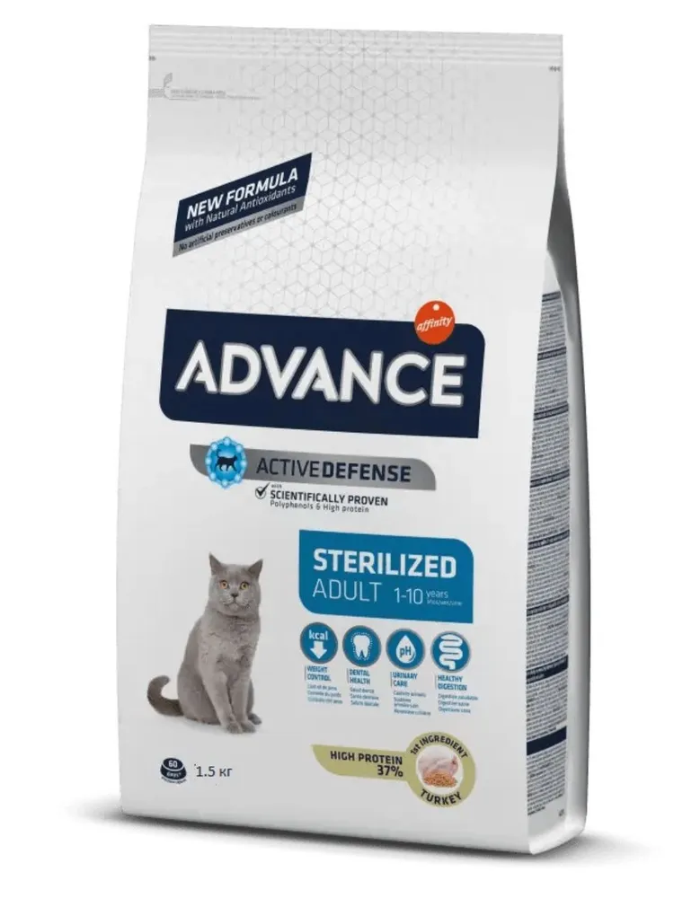 ADVANCE Sterilized Adult помогает естественной защите и барьерам вашей кошки, поддерживая оптимальный pH мочи и предотвращая образование зубного камня. Кроме того, благодаря своей формуле и тщательно подобранным ингредиентам он способствует здоровью кишечника и помогает контролировать вес вашей кошки.