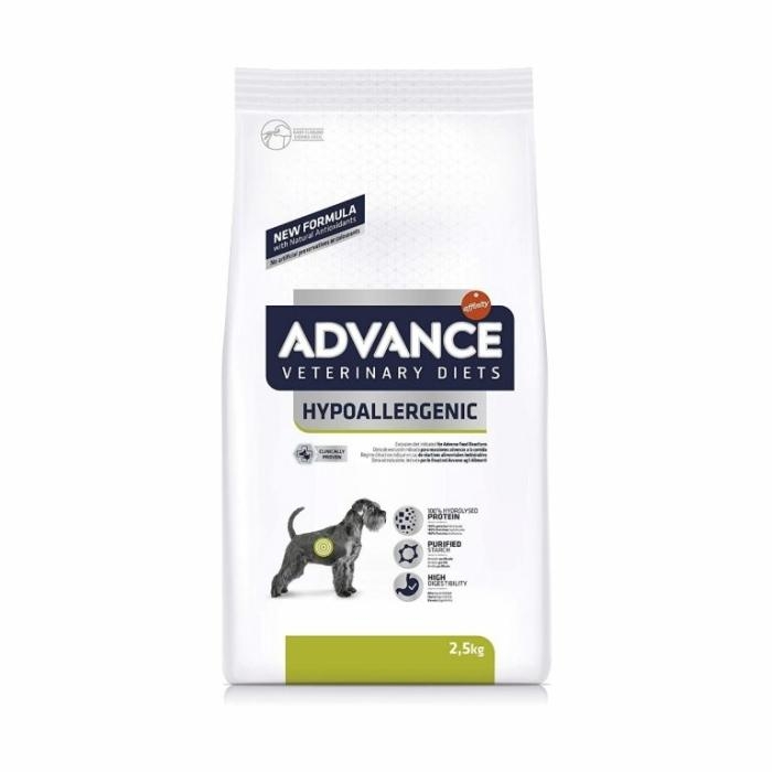 Advance VetDiet Hypoallergenic — полноценный диетический корм для щенков и взрослых собак, рекомендованный для снижения непереносимости к ингредиентам и питательным веществам. Корм содержит единственный источник белка и единственный источник углеводов, что способствует безопасному и легкому усвоению у собак с пищевыми аллергиями или непереносимостью.