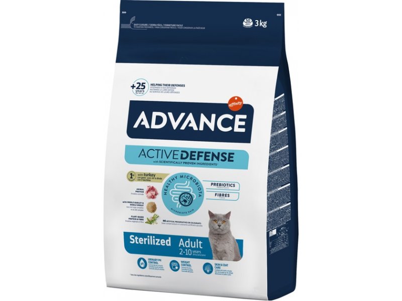 ADVANCE Sterilized Adult помогает естественной защите и барьерам вашей кошки, поддерживая оптимальный pH мочи и предотвращая образование зубного камня. Кроме того, благодаря своей формуле и тщательно подобранным ингредиентам он способствует здоровью кишечника и помогает контролировать вес вашей кошки.