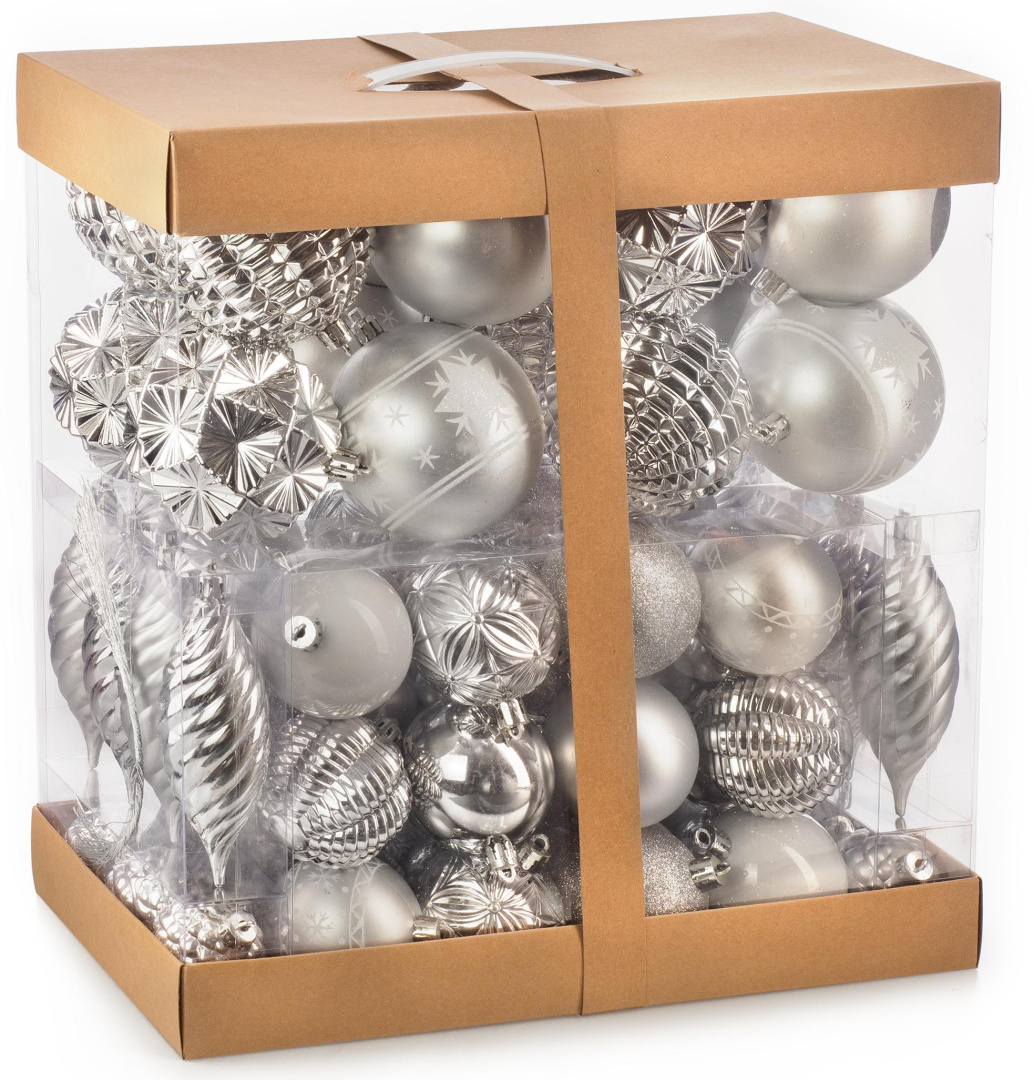 Набор ёлочных игрушек в серебряном цвете — универсальное решение для создания современного и утончённого новогоднего декора. Холодный металлический блеск придаёт ёлке аккуратный, стильный и праздничный вид.