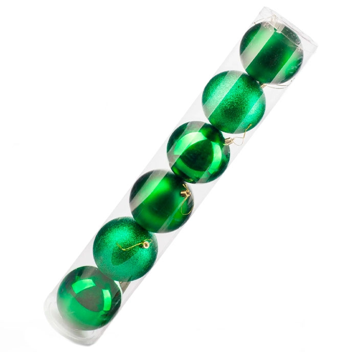 Набор из шести крупных шаров диаметром 10 см — это готовое решение для роскошного новогоднего декора. Солидный размер и оптимальное количество позволяют создать эффектное убранство на большой ёлке, придав празднику ощущение щедрости, тепла и настоящего волшебства. Идеальный выбор для тех, кто ценит выразительные акценты и безупречный стиль.