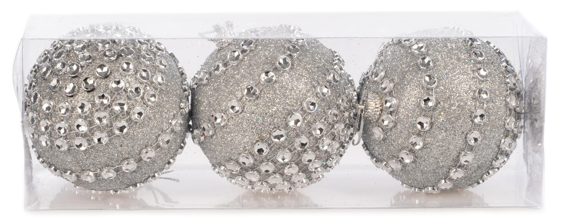 Этот набор из трёх серебряных шаров, украшенных сверкающими стразами, — настоящее сокровище для создания роскошного новогоднего декора. Крупный размер, зеркальная поверхность и сияющая инкрустация создают эффект драгоценных украшений, которые мгновенно превратят вашу ёлку или праздничную композицию в центр всеобщего восхищения. Это выбор для тех, кто хочет добавить в праздник ноту гламура и безупречного стиля.