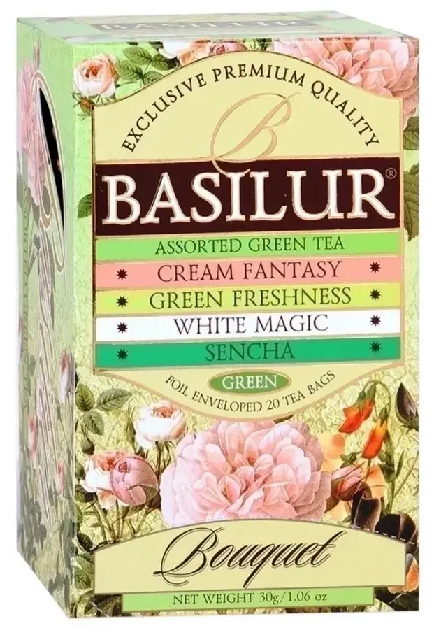 Откройте для себя разнообразие зеленого чая с натуральными ароматами, чтобы каждое чаепитие стало ярким, полезным и по-настоящему изысканным с Basilur Bouquet Ассорти.