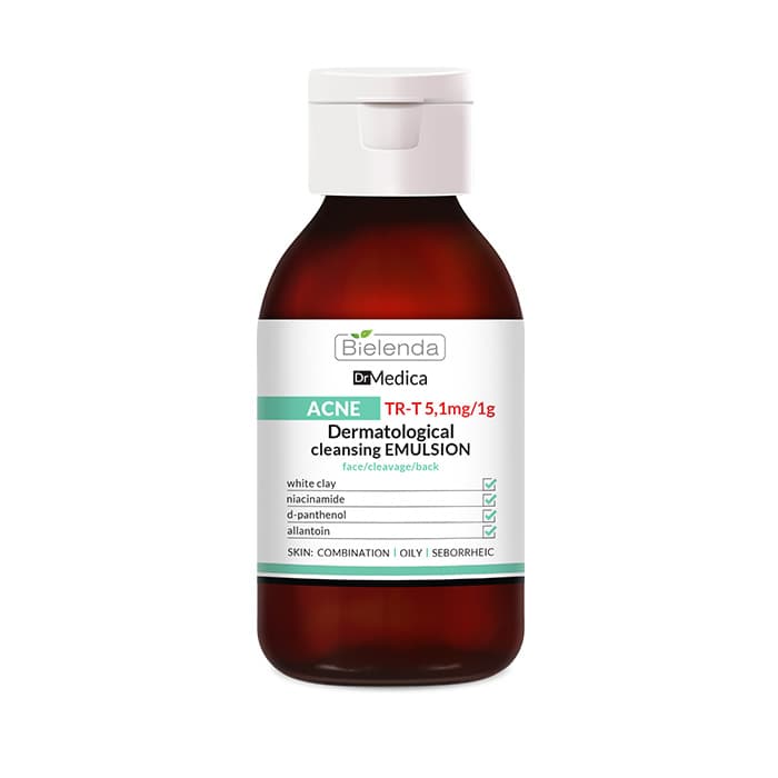 Дерматологическая очищающая эмульсия содержит специально разработанную формулу TR-T 5,1 мг / 1 г, состоящую из мощных активных веществ, которые действуют против акне. Эмульсия удаляет излишки себума и загрязнения, эффективно снимает макияж, уменьшает жирность и блеск кожи, уменьшает чрезмерную выработку себума, очищает и сужает поры, снимает раздражения и уменьшает покраснения кожи, вызванные акнеподобными изменениями, уменьшает акнеподобные изменения и предотвращает появление новых, увлажняет и успокаивает кожу. Дерматологически протестировано.