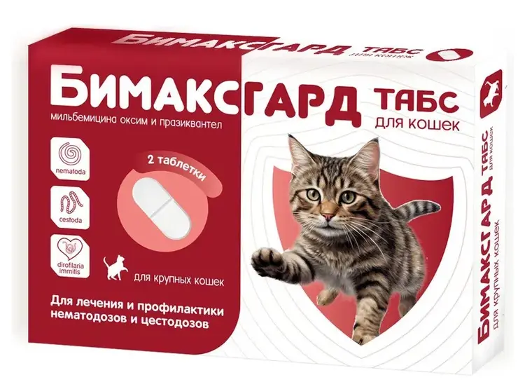 Бимаксгард® ТАБС для крупных кошек обеспечивает комплексную защиту от паразитов, удобен в применении и безопасен для животных разных возрастов. Поддерживайте здоровье и активность вашего питомца — выбирайте Бимаксгард® ТАБС уже сегодня!