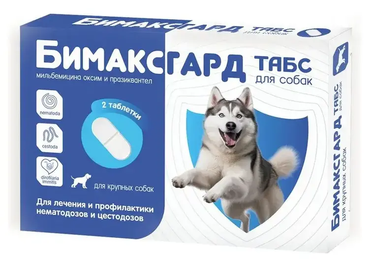 Бимаксгард® ТАБС — современный антигельминтный препарат для крупных собак. Таблетки эффективно борются с широким спектром нематод и цестод, включая сердечных гельминтов (дирофиляриоз), обеспечивая защиту питомца на всех стадиях паразитарного заражения. Препарат подходит для щенков с 2 недель и весом от 500 г, а также для беременных и кормящих собак.