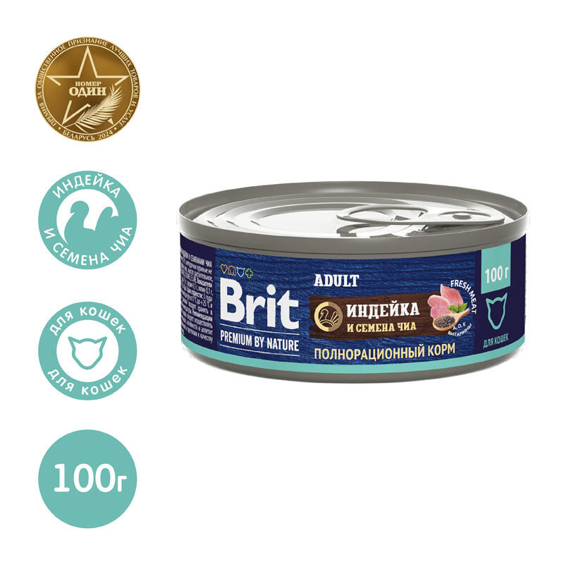 Состав: мясо и субпродукты (в т.ч. мясо индейки не менее 15 %, курица не менее 10 %, желудочки куриные не менее 10 %, печень не менее 3 %), семена чиа, гидролизат куриного белка, клетчатка, рыбий жир, масло растительное, витамины группы B, РР, K, Na, Mg, Fe, Cu, I, Se, Са и Р (1 / 0,8), витамины (питательные добавки на 100 г): А 500 МЕ, D3 50 ME, Е 5 МЕ.