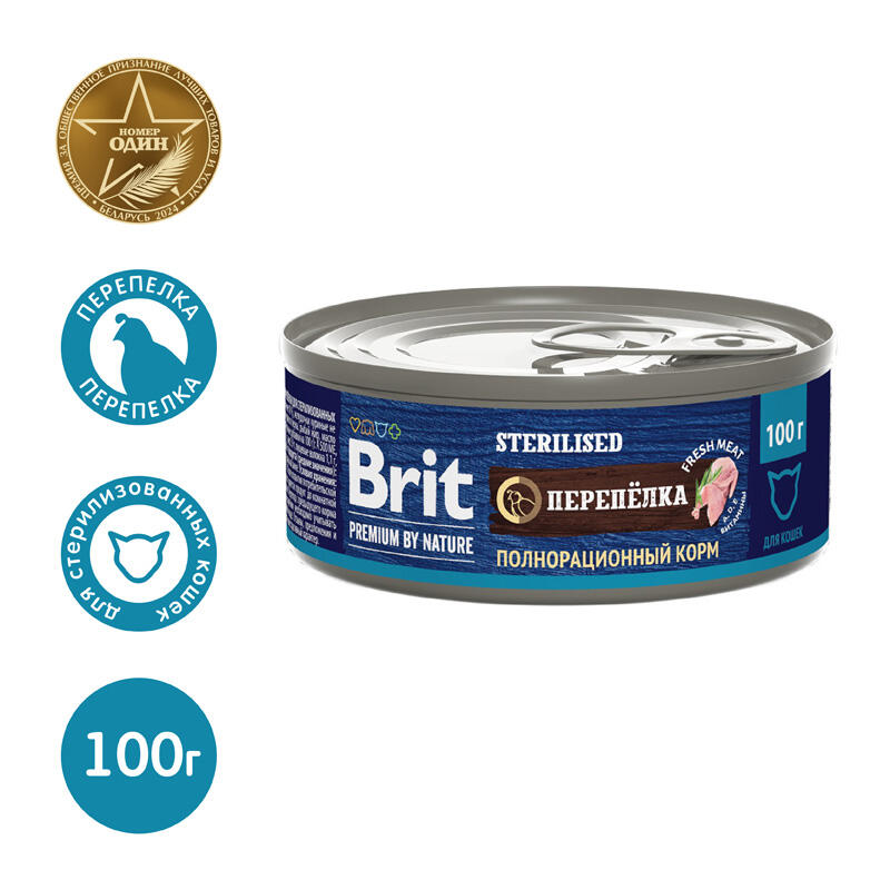 Полнорационный влажный консервированный корм премиум-класса Brit Premium by Nature с мясом перепёлки для стерилизованных кошек.