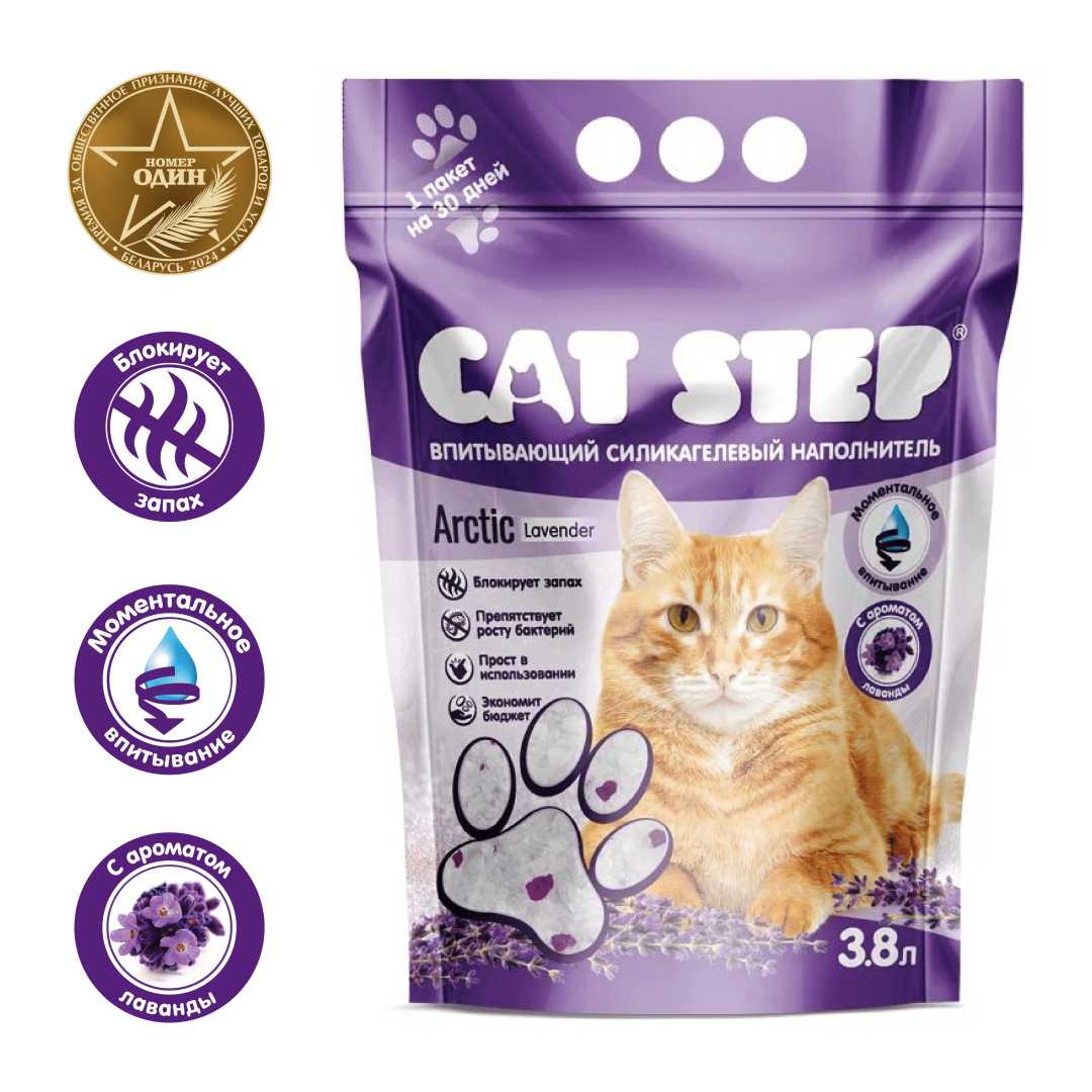 Моментально впитывает влагу и уничтожает запахи! Пористая структура кристаллов обеспечивает их высокую способность к поглощению жидкостей и запахов. Наполнитель препятствует размножению и развитию бактерий и грибков за счет своего неорганического происхождения. Не требует постоянного контроля и ежедневной уборки кошачьего лотка. Содержимого пакета 3,8 л хватает в среднем на 1 месяц использования. Содержит фиолетовые гранулы c легким ароматом лаванды, активирующимся при контакте с жидкостью. Заполните сухой и чистый лоток наполнителем CAT STEP Arctic Lavеnder слоем 3-5 см. Регулярно удаляйте экскременты и перемешивайте наполнитель для равномерного распределения свежих кристаллов. Примерно через 4 недели удалите использованные гранулы и замените их новой порцией наполнителя. Не выбрасывайте использованный наполнитель в унитаз. Объем: 3,8 л.