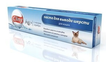 Паста для вывода шерсти Cliny способствует естественному выведению комков шерсти (безоаров) из желудка животных. Избавляет кошек от рвоты, потери аппетита, закупорки кишечника, запоров. Обладает привлекательным для кошек вкусом и ароматом солода. Состав пасты имеет уникальную формулу: - Солодовый экстракт смягчает волосяные комки и облегчает продвижение волосяной массы через пищеварительный тракт; - Ионы серебра обладают выраженным дезинфицирующим действием широкого спектра. Показания: Применяют кошкам, котятам, хорькам для вывода волосяных комков из желудочно-кишечного тракта и профилактики их образования. Побочные действия: У чувствительных животных в очень редких случаях возможны аллергические реакции. В этих случаях применение пасты прекращают.