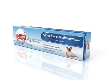 Паста для вывода шерсти Cliny способствует естественному выведению комков шерсти (безоаров) из желудка животных. Избавляет кошек от рвоты, потери аппетита, закупорки кишечника, запоров. Обладает привлекательным для кошек вкусом и ароматом солода. Состав пасты имеет уникальную формулу: - Солодовый экстракт смягчает волосяные комки и облегчает продвижение волосяной массы через пищеварительный тракт; - Ионы серебра обладают выраженным дезинфицирующим действием широкого спектра. Показания: Применяют кошкам, котятам, хорькам для вывода волосяных комков из желудочно-кишечного тракта и профилактики их образования. Побочные действия: У чувствительных животных в очень редких случаях возможны аллергические реакции. В этих случаях применение пасты прекращают.