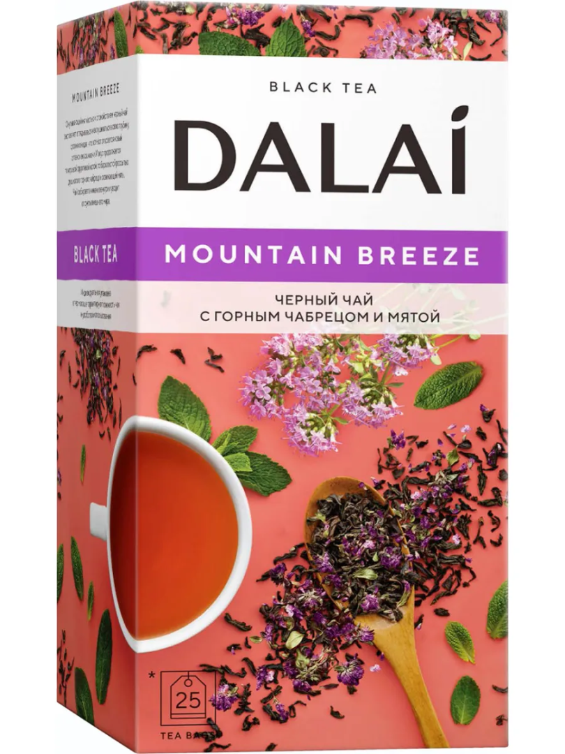Подарите себе наслаждение бархатистым вкусом черного чая, освежающими нотами мяты и горного чабреца с DALAI Маунтин Бриз, чтобы каждое чаепитие стало моментом умиротворения и бодрости.