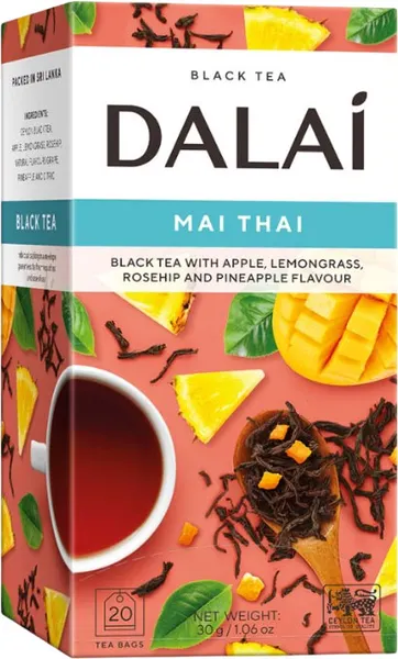Чай DALAI Mai Thai сочетает цейлонский черный чай, ананас, лемонграсс и шиповник, создавая насыщенный и бодрящий напиток. Каждый глоток переносит в мир экзотики и свежести, пробуждает воображение и дарит удовольствие от гармоничного сочетания сладости и цитрусовой кислинки.