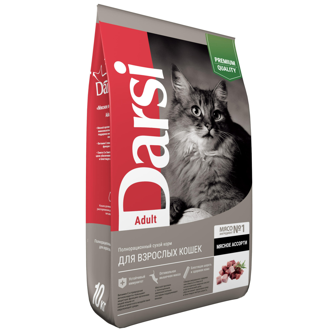 Полнорационный сухой корм "Мясное ассорти" для взрослых кошек. Содержит мясной протеин с полноценным аминокислотным составом, а так же Омега-3 и Омега-6 жирные кислоты.
