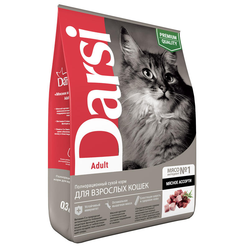 Полнорационный сухой корм "Мясное ассорти" для взрослых кошек. Содержит мясной протеин с полноценным аминокислотным составом, а так же Омега-3 и Омега-6 жирные кислоты.