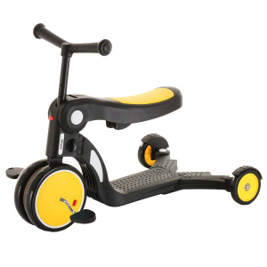 Может трансформироваться из 2-х колесного самоката или беговела в 3-х колесный и быстро переделывается в трехколесный велосипед.