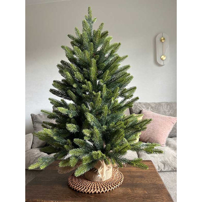 Ель Венеция люкс выполнена полностью из литых веток, которые отгибаются от ствола. Подставка усилена и обтянута мешковиной.