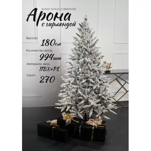 Искусственная елка Arona плюс высотой 1,8 метра создана, чтобы подарить вашему дому волшебную новогоднюю атмосферу. Пышная заснеженная хвоя и встроенные лампочки делают эту елку центром внимания и создают ощущение зимней сказки.