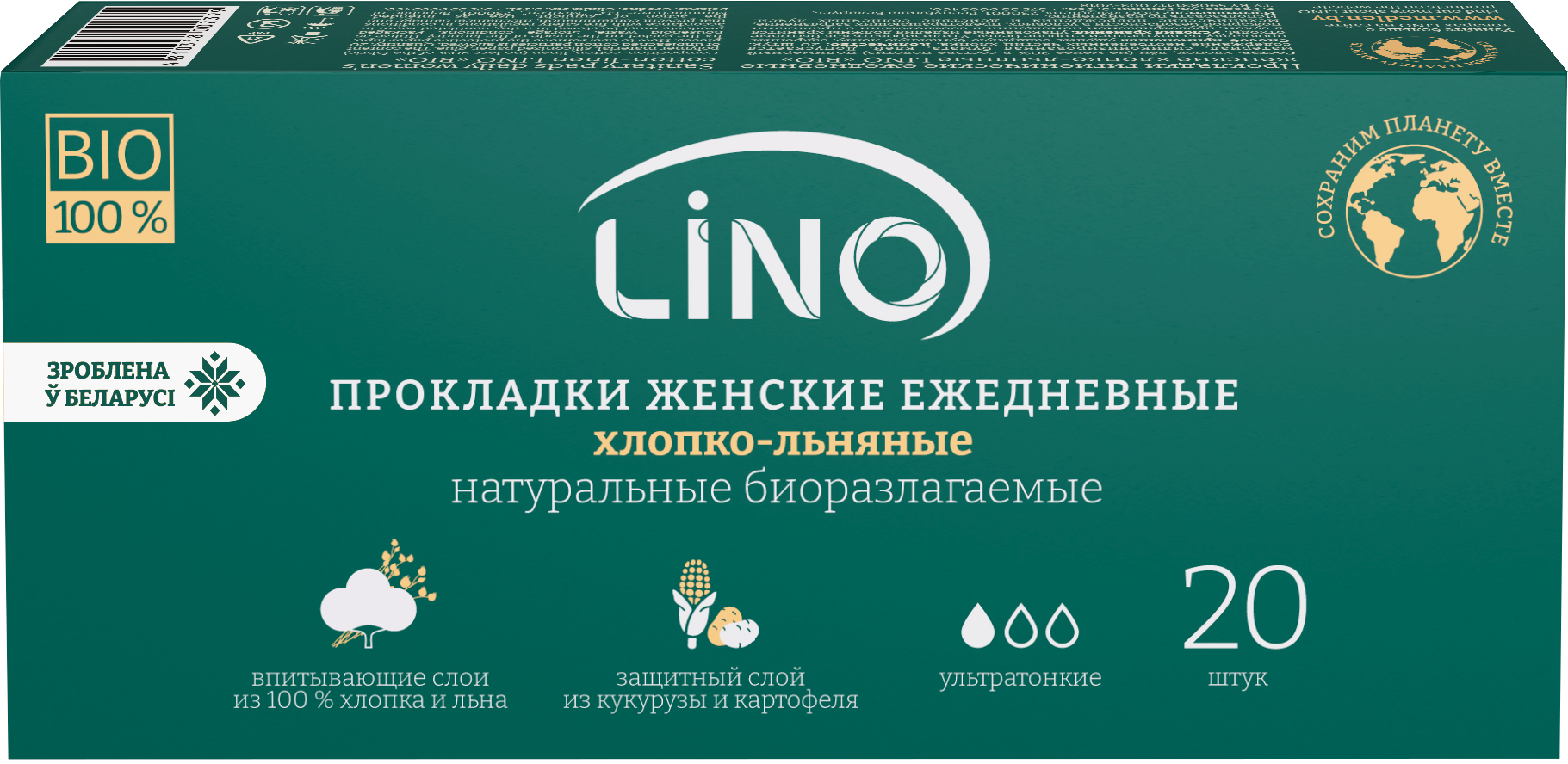 LINO BIO Хлопко-Льняные Гигиенические Прокладки — ультратонкие 0,6 мм, биоразлагаемые, 20 шт