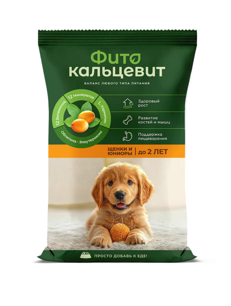 ФИТОКАЛЬЦЕВИТ ДЛЯ ЩЕНКОВ И ЮНИОРОВ ДО 2 ЛЕТ Специально разработан для поддержки здоровья растущего организма и активного развития питомцев; Здоровый рост; Развитие костей и мышц; Поддержка пищеварения. 12 Витаминов, 12 Минералов, Облепиха и элеутерококк, L-карнитин. Экстракты облепихи и элеутерококка повышают сопротивляемость заболеваниям и укрепляет иммунитет питомца. L-карнитин помогает развитию сухой мышечной массы и ускоряет восстановление после тренировок и активных игр.