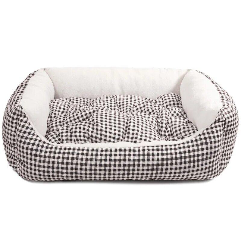 Комбинированная лежанка из флиса и 100% хлопковой ткани. Внутренняя сторона изделия и подстилка выполнены из флиса, дно изготовлено из спанбонда с антискользящим покрытием,наполнитель – синтепух.