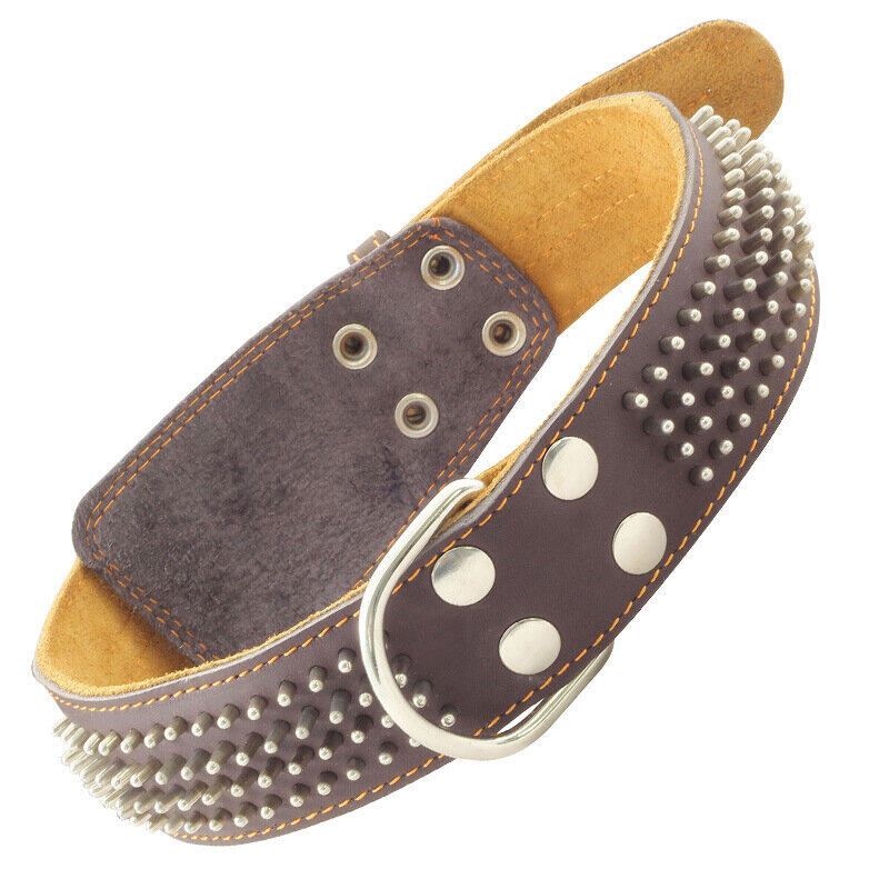 Толстый кожаный ошейник - для собак крупных пород. Предусмотренные отверстия позволяют удобно подгонять длину под индивидуальные параметры животного, а выносное металлическое кольцо отлично подойдет для надежного крепления карабина поводка, адресника или других аксессуаров.