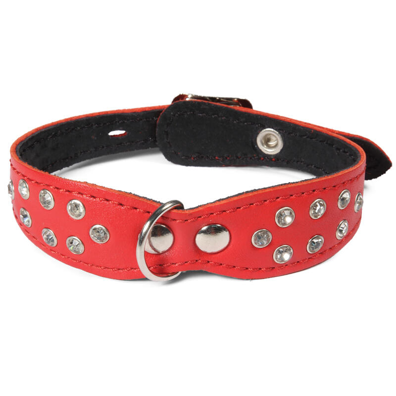 Стильный кожаный ошейник - оригинальный и функциональный аксессуар для небольших собак. Двухслойное изделие со стразами выполнено из мягкой, но прочной цветной кожи высокого качества с использованием крепкой металлической фурнитуры. Длину изделия удобно подгонять под индивидуальные параметры животного, а прочное металлическое кольцо ошейника отлично подойдет для крепления поводка, адресника или других аксессуаров. Размер изделия: 270*12*2мм. Варианты расцветок: синий, красный, черный.