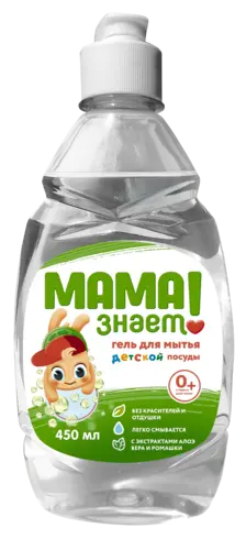 Гель для мытья посуды детской «МАМА ЗНАЕТ!» «Алоэ вера и ромашка», 450 мл предназначен для мытья всех видов посуды для детей с первых дней жизни в горячей и холодной воде.