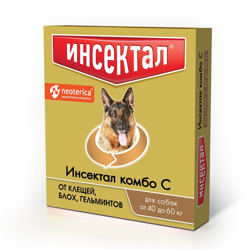 Инсектал комбо С назначают собакам для лечения и профилактики энтомозов, демодекоза, отодектоза, саркоптоза, акарозов, вызываемых иксодовыми клещами, нематодозов желудочно-кишечного тракта (токсокароз, токсаскаридоз, унцинариоз, анкилостомоз, трихоцефалез), а также в целях профилактики дирофиляриоза. После однократной обработки инсектицидное действие препарата продолжается до 6 недель, акарицидное – до 4 недель.