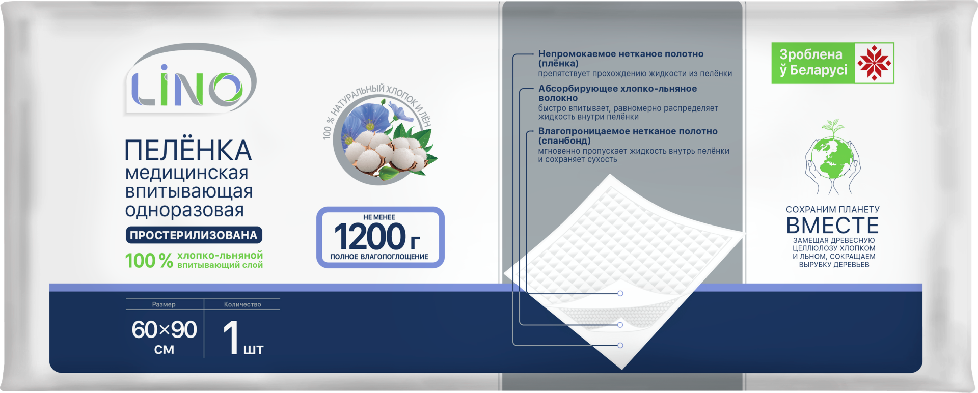 Пелёнки медицинские одноразовые LINO с впитывающим слоем из натуральных хлопка и льна. Без синтетических суперабсорбентов (SAP) и хлора. С бактериостатическим эффектом (сдерживает размножение бактерий). Нестерильные.