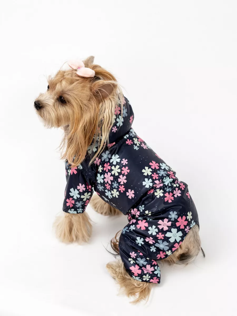 Комбинезон дождевик для девочек с закрытым животом для собак: легкий, демисезонный. Выполнен из мягкой качественной плащовки синего цвета со стильным цветочным принтом.