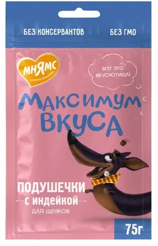 Мнямс «Максимум вкуса» — вкусные подушечки с индейкой, созданные специально для щенков с учетом их физиологических особенностей. Лакомство разработано при участии ветеринарных врачей и подходит для ежедневного поощрения и угощения маленьких питомцев.