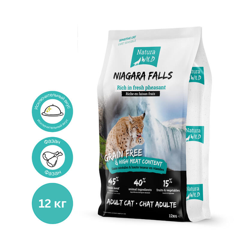 Natura Wild Niagara Falls - полнорационный беззерновой корм для кошек холистик класса. Корм содержит: свежее мяса фазана - 45%, общее содержание ингредиентов животного происхождения - 85%. Назначение: для привередливых кошек с чувствительным пищеварением или аллергией. Особенности и преимущества корма: беззерновая гипоаллергенная рецептура, высокое содержание свежего мяса фазана (45%), Омега-3 и Омега-6 жирные кислоты в составе, пребиотики высокого качества (корень цикория). Возраст: от 1-го года. Подходит для кошек старше 6-ти лет в качестве основного рациона.