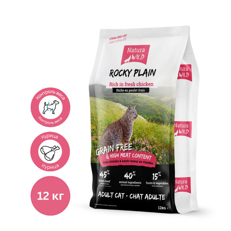 Natura Wild Rocky Plain - полнорационный беззерновой корм холистик класса для взрослых стерилизованных кошек. Может быть использован в качестве основного рациона с 8-ми месячного возраста. Корм содержит: свежее мясо курицы 45%, общее содержание ингредиентов животного происхождения - 85%. Назначение: для взрослых стерилизованных кошек. Особенности и преимущества корма: беззерновая рецептура, низкое содержание жира, высокое содержание свежего мяса курицы (45%), низкое содержание магния и фосфора, Омега-3 и Омега-6 жирные кислоты, натуральные антиоксиданты. Возраст: для взрослых кошек с 1 года. Может быть использован в качестве основного рациона для котят после кастрации с 8-ми месяцев.