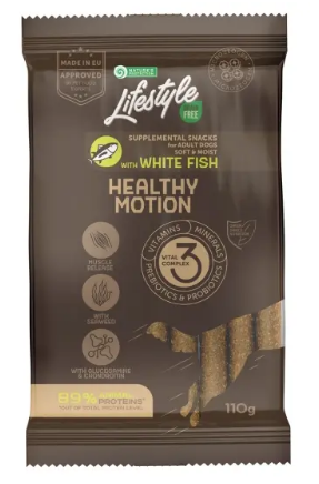Лакомство Nature’s Protection Lifestyle Grain Free Healthy Motion с белой рыбой и глюкозамином специально разработано для взрослых собак всех пород. Оно способствует укреплению костей и суставов, а также поддержанию активного образа жизни вашего питомца.