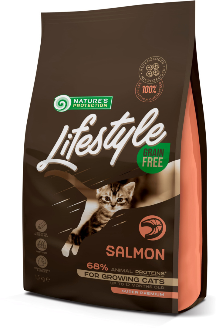 Lifestyle Grain Free Salmon Kitten — это на 100% полноценный, сбалансированный, беззерновой сухой корм с сертифицированным лососем премиум-класса из Норвегии и антарктическим крилем для котят до 12 месяцев. Подходит для беременных и кормящих кошек Корм богат незаменимыми жирными кислотами Омега-3 и Омега-6, которые особенно ценны для укрепления иммунной системы, поддержания нормального функционирования мозга, сердечно-сосудистой системы и облегчения воспалительных процессов.