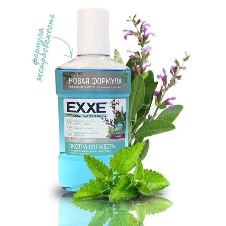 Экстра свежесть "Мята и шалфей" для ежедневного комплексного ухода за полостью рта: защищает от налета и зубного камня, обладает отбеливающим эффектом, освежает дыхание. Ополаскиватель для полости рта ЕХХЕ содержит в составе комплекс экстрактов и компонентов, обладающий общеукрепляющими свойствами и освежающим эффектом. Укрепляет десны, освежает дыхание, оказывает противовоспалительное действие. Экстракт лимона обладает витаминизирующим и отбеливающим эффектом. Рекомендуется использовать в комплексе с зубной пастой ЕXXE для длительной свежести дыхания и предупреждения развития кариеса и пародонтита.