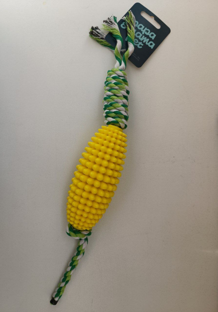 Прочная игрушка для собак, изготовлена из литой резины и хлопковой веревки. За счёт рельефного рисунка на резине, игрушка станет незаменимым тренажером для щенков в период прорезывания зубов.