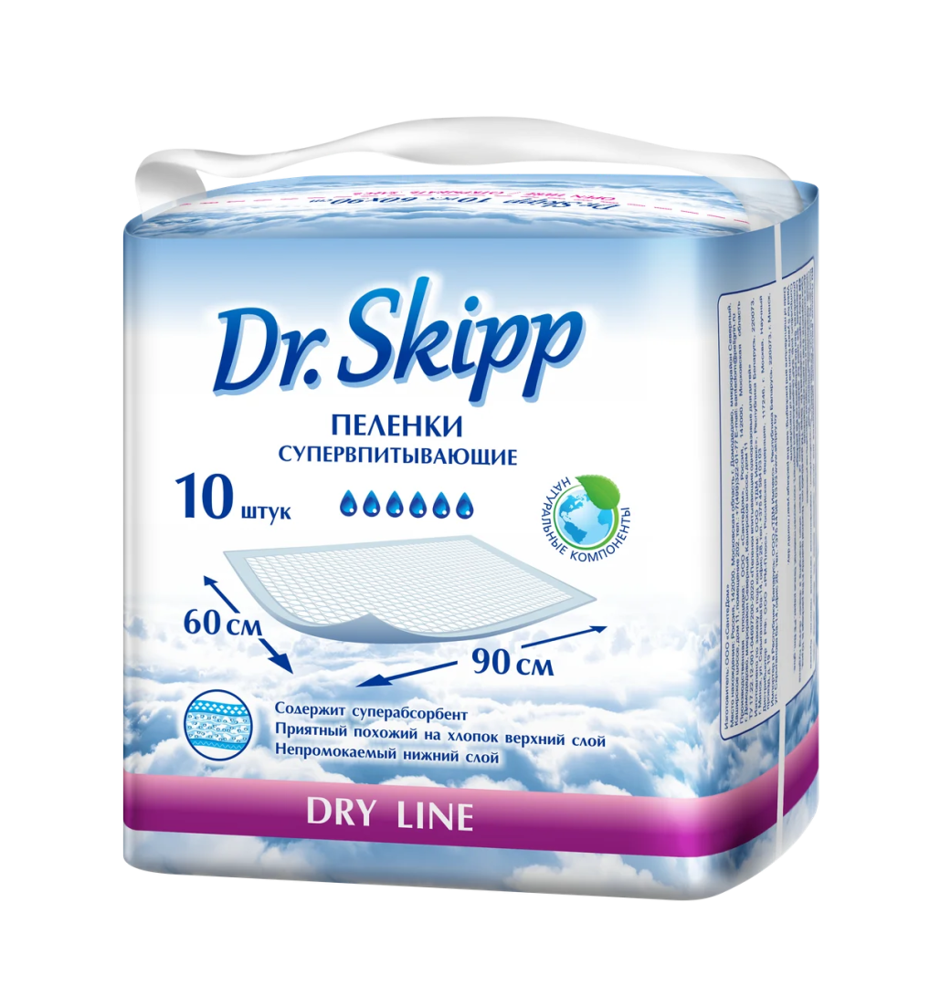 Одноразовые гигиенические впитывающие пеленки Dr.Skipp Dry Line - предназначены для надёжной защиты постели как ребенка, так и взрослого человека в случае протекания подгузника. Благодаря существенному количеству SAP (суперабсорбента–полимера) в составе пеленок, поступающая влага моментально превращается в гель и надежно удерживается внутри, а нижний слой, состоящий из матовой полиэтиленовой пленки, полностью исключает дальнейшее распространение влаги.