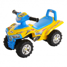 Модель выполнена в форме квадроцикла, имеет большие колеса с рисунком на шинах и просторное сиденье для комфортной посадки. На руле расположены 2 кнопки, которые воспроизводят веселые песенки (батарейки в комплект не входят). Под сиденьем есть вместительный отсек для хранения любимых игрушек. Специальный стопор сзади защитит каталку от опрокидывания.