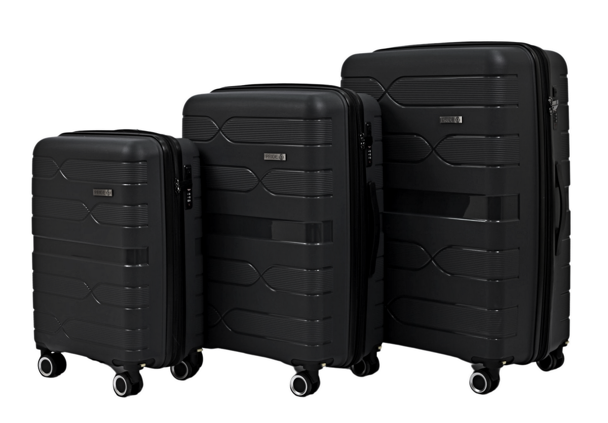 Яркий и стильный комплект чемоданов Pride PP204 в базовом черном цвете станет вашим надежным спутником в путешествиях. В набор входят три размера — малый, средний и большой — чтобы удобно разместить вещи для коротких и длительных поездок.