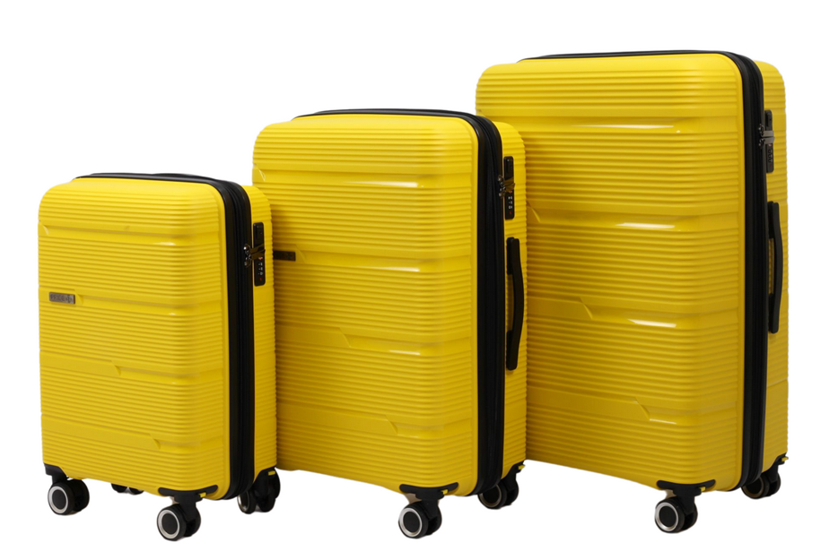 Яркий комплект чемоданов PRIDE PP9702 в насыщенном желтом цвете — идеальный выбор для тех, кто хочет путешествовать с комфортом и выделяться в потоке багажа. В набор входят три размера для любых задач: от ручной клади до длительных поездок.