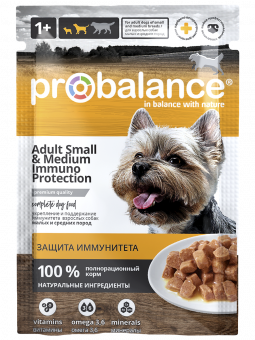 Влажный рацион Probalance Immuno Protection разработан практикующими датскими ветеринарами. Корм учитывает индивидуальные особенности собак малых и средних пород. Разнообразные мясные компоненты корма обеспечивают высокие потребности собак в белке. Природные антиоксиданты, содержащиеся в кусочках мяса, необходимы для укрепления иммунитета, а специально подобранный пребиотик поддерживает здоровую микрофлору кишечника.