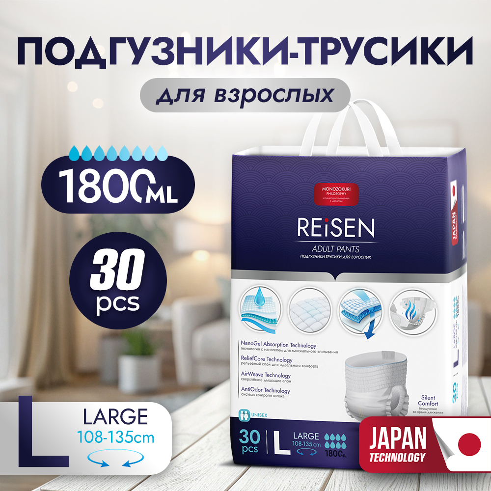 Одноразовые подгузники-трусики REISEN — надежное решение для людей с недержанием и ограниченной подвижностью. Инновационные технологии обеспечивают максимальную впитываемость до 1800 мл, комфорт и защиту кожи на протяжении всего дня.