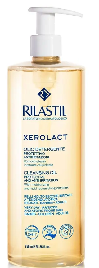 Rilastil Xerolact Cleansing Oil — мягкое очищающее масло для лица и тела, разработанное специально для сухой, очень сухой, чувствительной и атопичной кожи. Средство эффективно удаляет загрязнения, уменьшая раздражение и дискомфорт, восстанавливает липидный баланс и укрепляет защитный барьер кожи. Подходит для младенцев, детей и взрослых.
