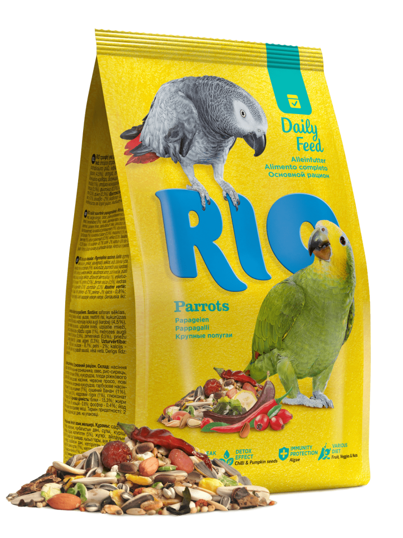 Ингредиенты: Семена сафлора, Сорго белое, Гречиха, Семена подсолнечника, Овес, Рис падди, Кукурузные хлопья, Канареечнное семя, Плоды шиповника, Кукуруза, Плоды рожкового дерева (кэроб), Пшеница, Полезные семена, Красное просо, Воздушная пшеница, Воздушный ячмень, Воздушная кукуруза, Семечки тыквенные, Рябина, сушеная, Банан сушеный, Сушеный перец, Арахис, Кедровый орех, Глюконат кальция, Водоросли, Полезные семена, Красное просо, Воздушная пшеница, Воздушный ячмень, Воздушная кукуруза, Семечки тыквенные, Рябина сушеная, Банан сушеный, Сушеный перец, Арахис, Кедровый орех, Глюконат кальция, Водоросли. Рекомендации по кормлению: Суточная норма: 40-50 г корма RIO для крупных попугаев. У птицы всегда должна быть свежая вода. В рацион необходимо включать свежие фрукты, овощи и Минеральную смесь RIO.